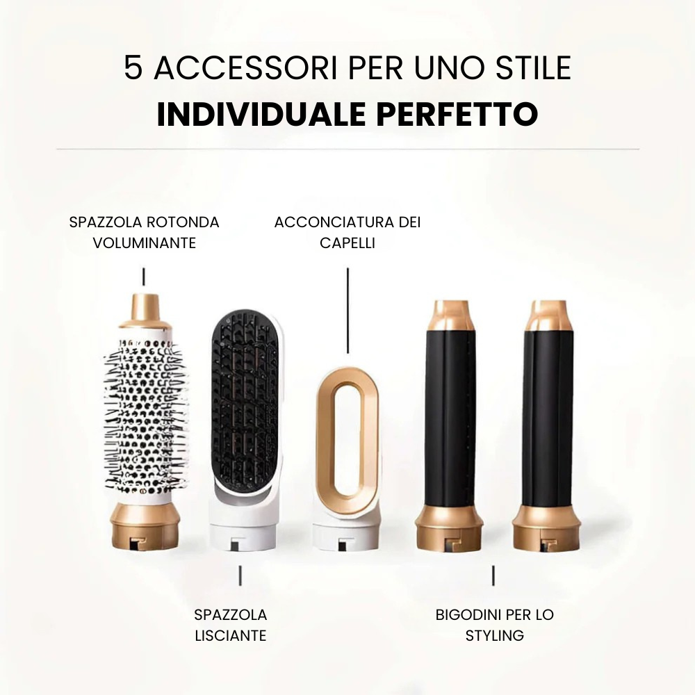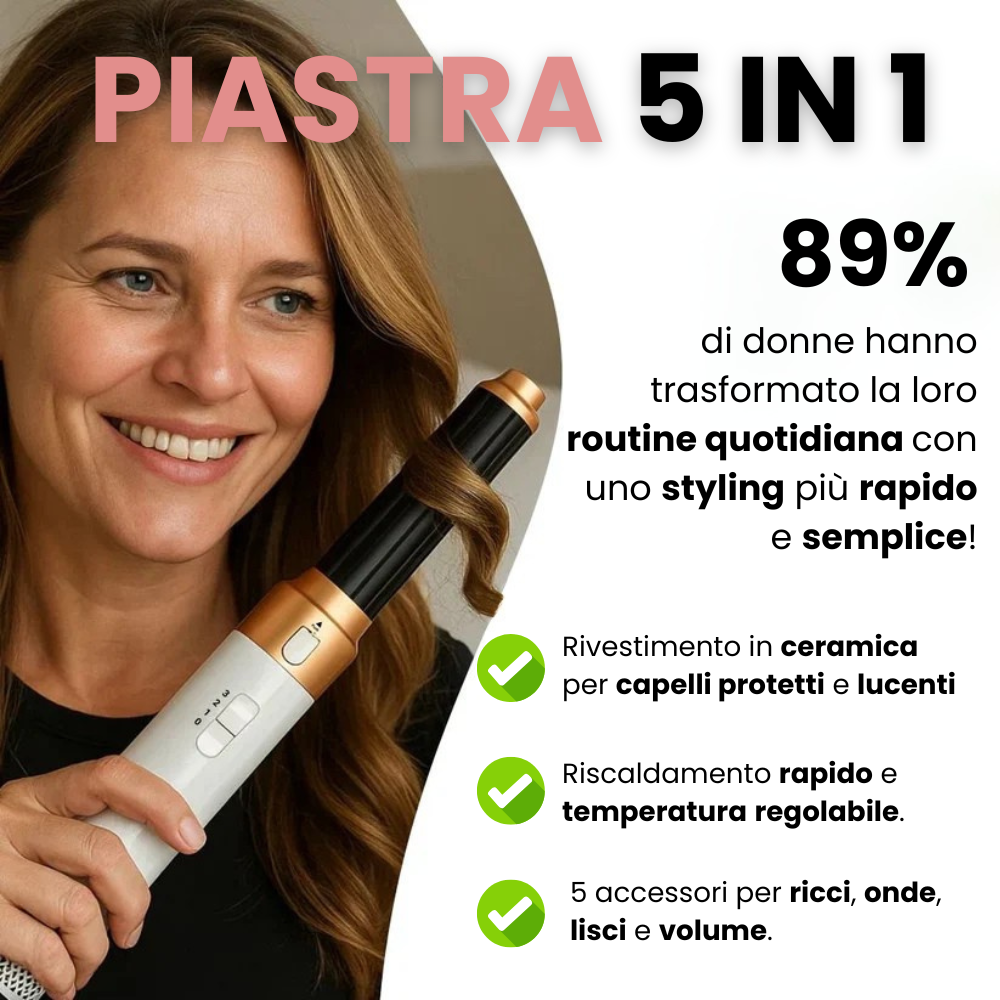 L’arricciacapelli 5 in 1 offre 5 testine intercambiabili per creare diversi stili: ricci, onde, volume o liscio.