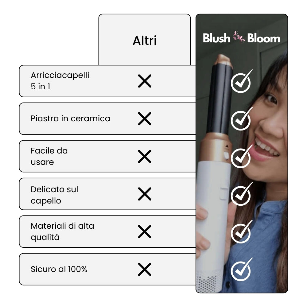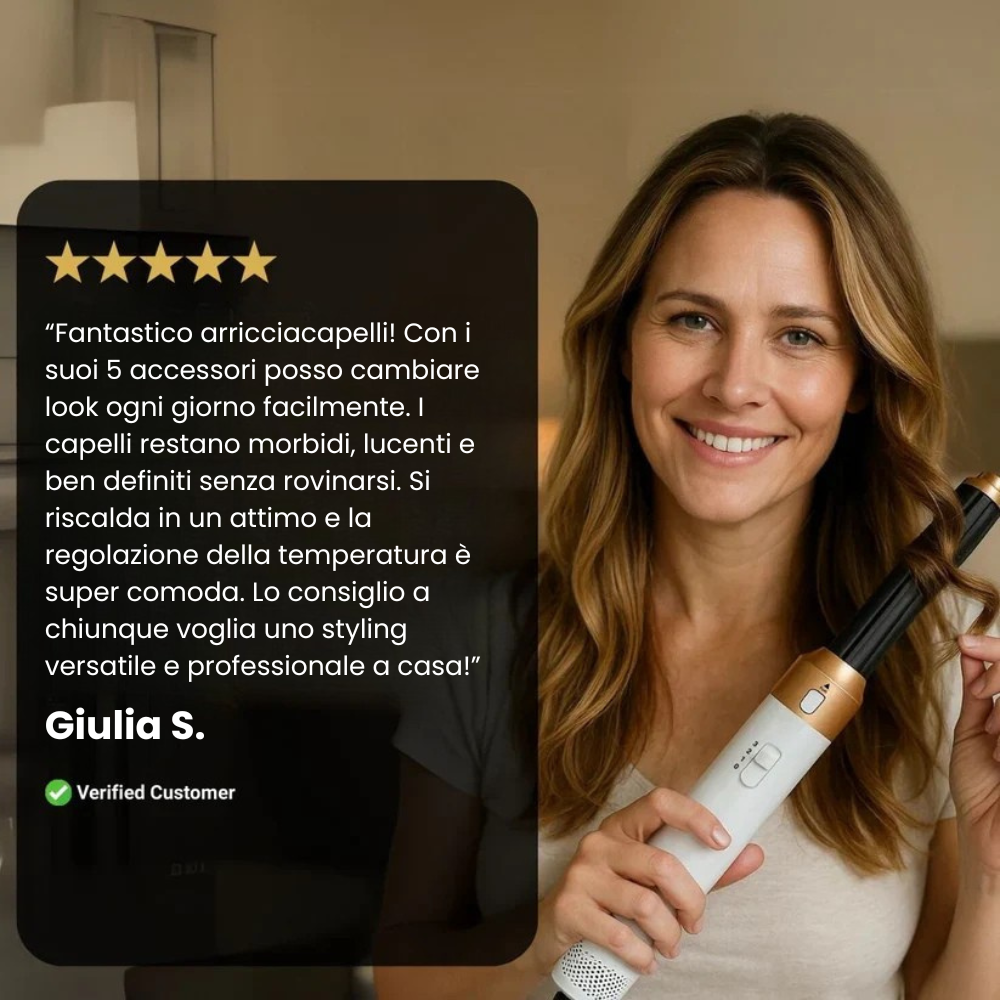 Con l’arricciacapelli 5 in 1 basta davvero poco: scegli l’accessorio, imposti la temperatura e sei pronta a trasformare i tuoi capelli.